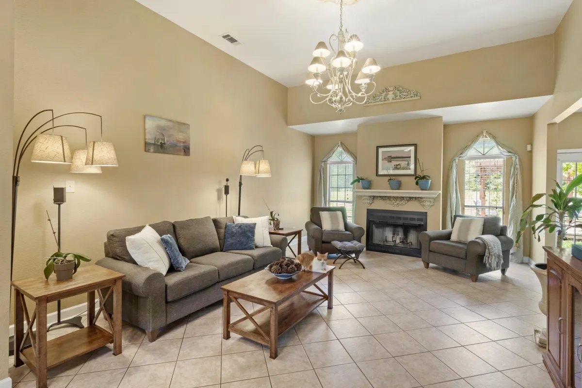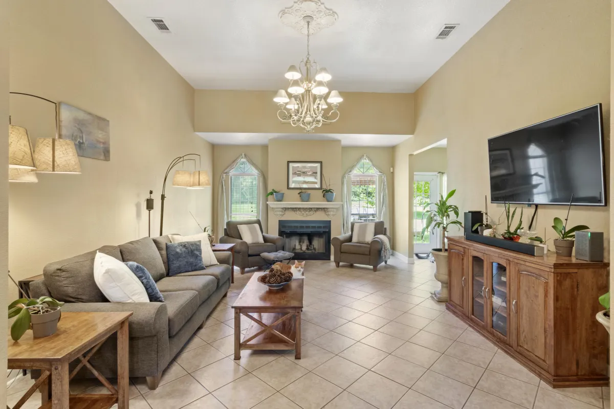 As you enter, you are greeted by a view of the inviting living room, complete with a cozy wood-burning fireplace and beautiful windows that offer a stunning view of the expansive backyard. High ceilings throughout the home create an open and airy atmosphere, enhancing the sense of space and light.