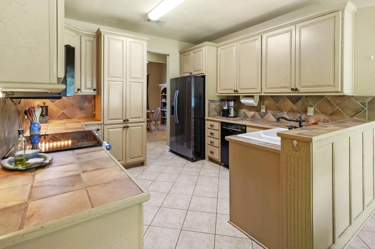 The eat-in kitchen features ample counter space and a casual dining area, making it perfect for morning coffee or casual meals.